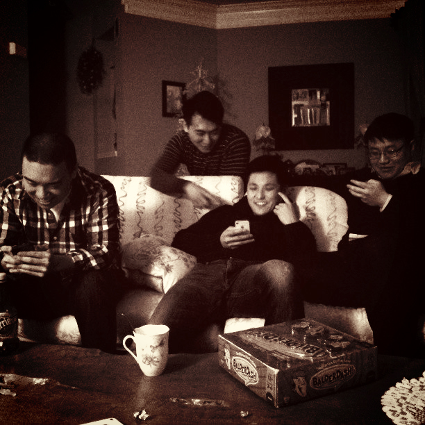 A friend (waddup @esmham!) took the above candid photo this past weekend and I Instagrammingly loved it. The picture is of a few old friends and I, intensely staring at our smartphones. Why? No we weren’t Snapchatting or Instagramming or Facebooking or Tweeting or even texting.